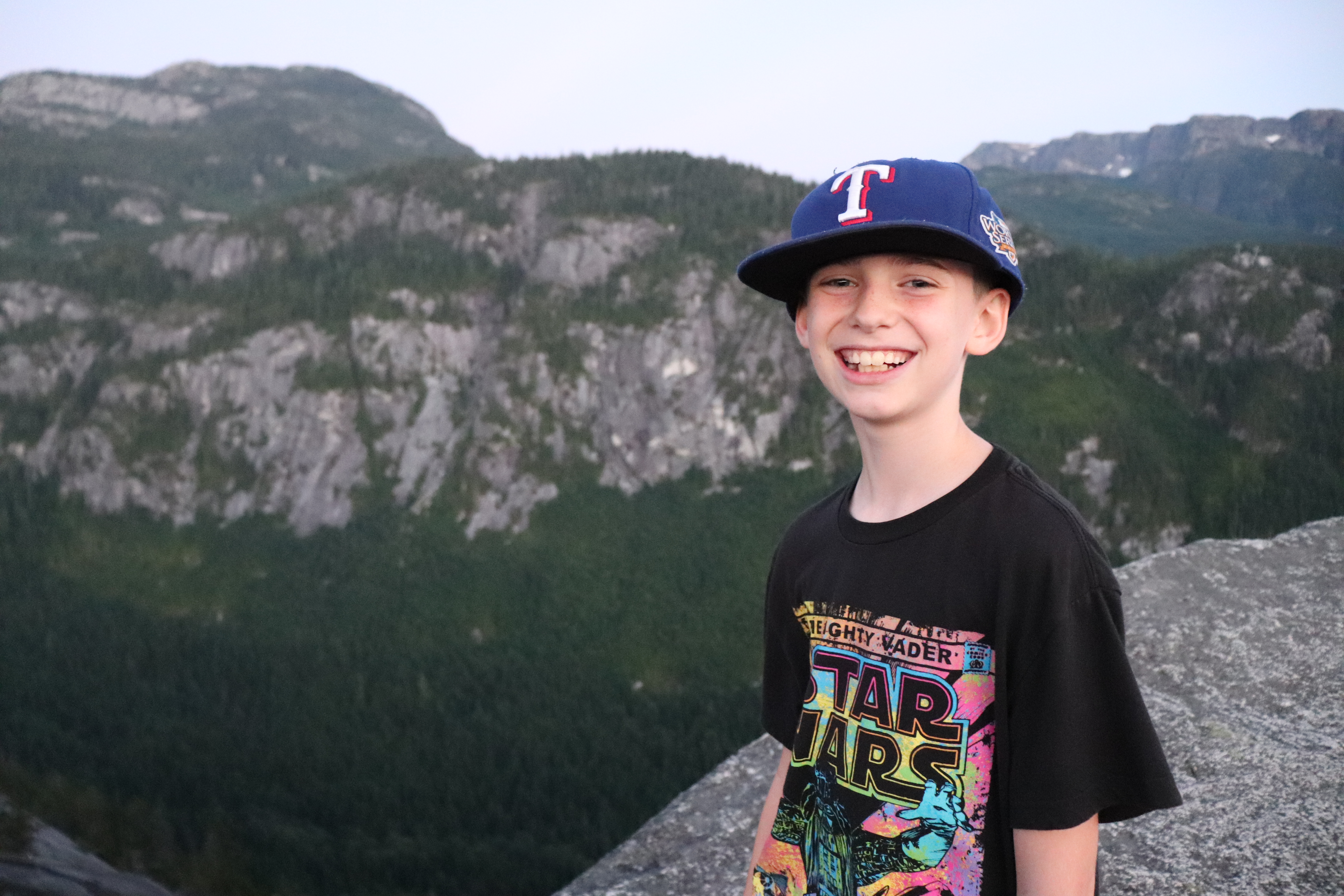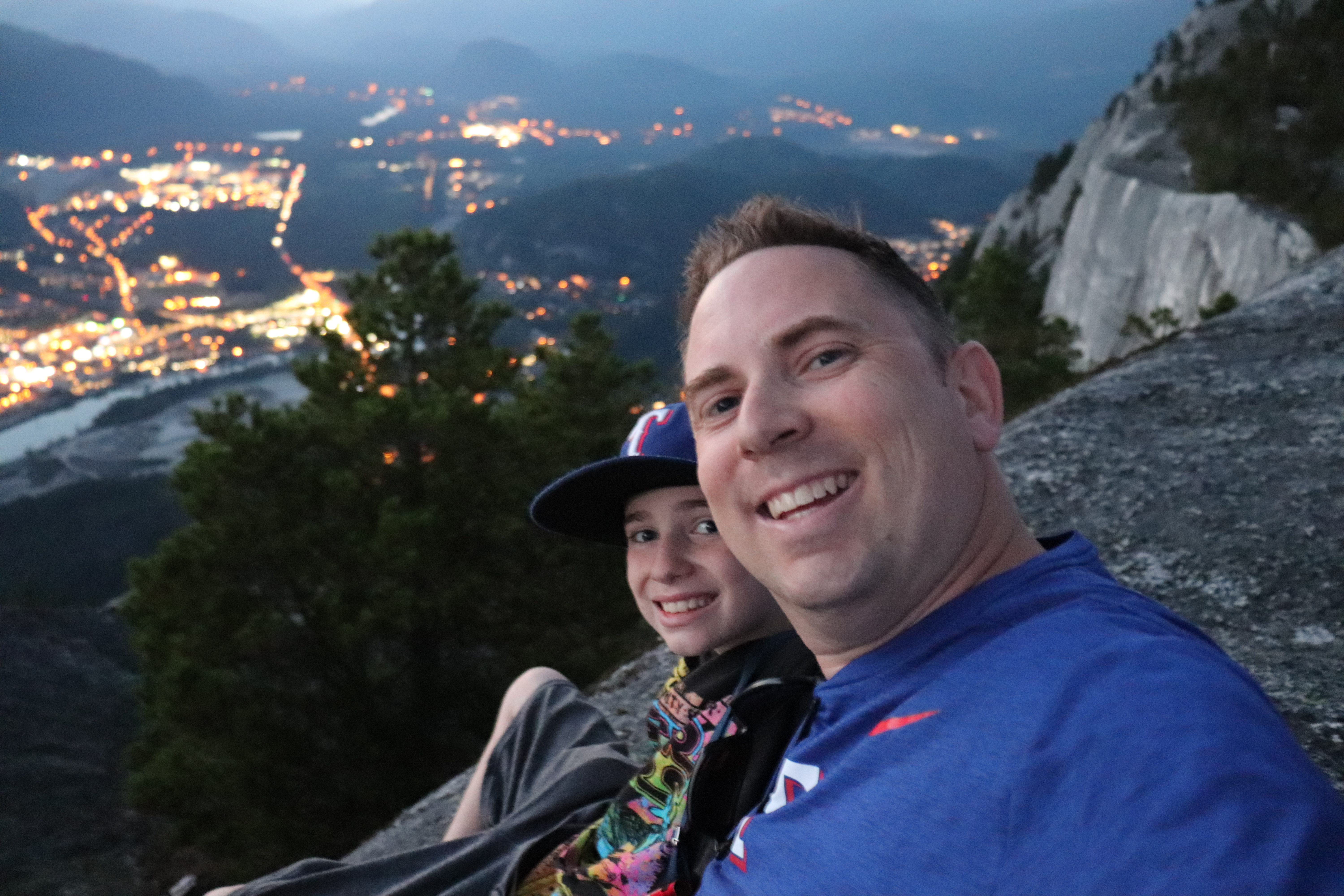 Once we cleared the tree line, we found permanent ladder-steps and chains to help us scale some steep rock faces. The experience was really cool for Connor who had never really hiked up a mountain before. We finally made our summit around 90 minutes into our hike, and the views were out of this world! The sun had dipped below the mountains to the west, but the colors on the horizon were still amazing. We took a lot of pictures and video after enjoying a little rest on the mountaintop. Then, we began to make our way down as it grew dark.